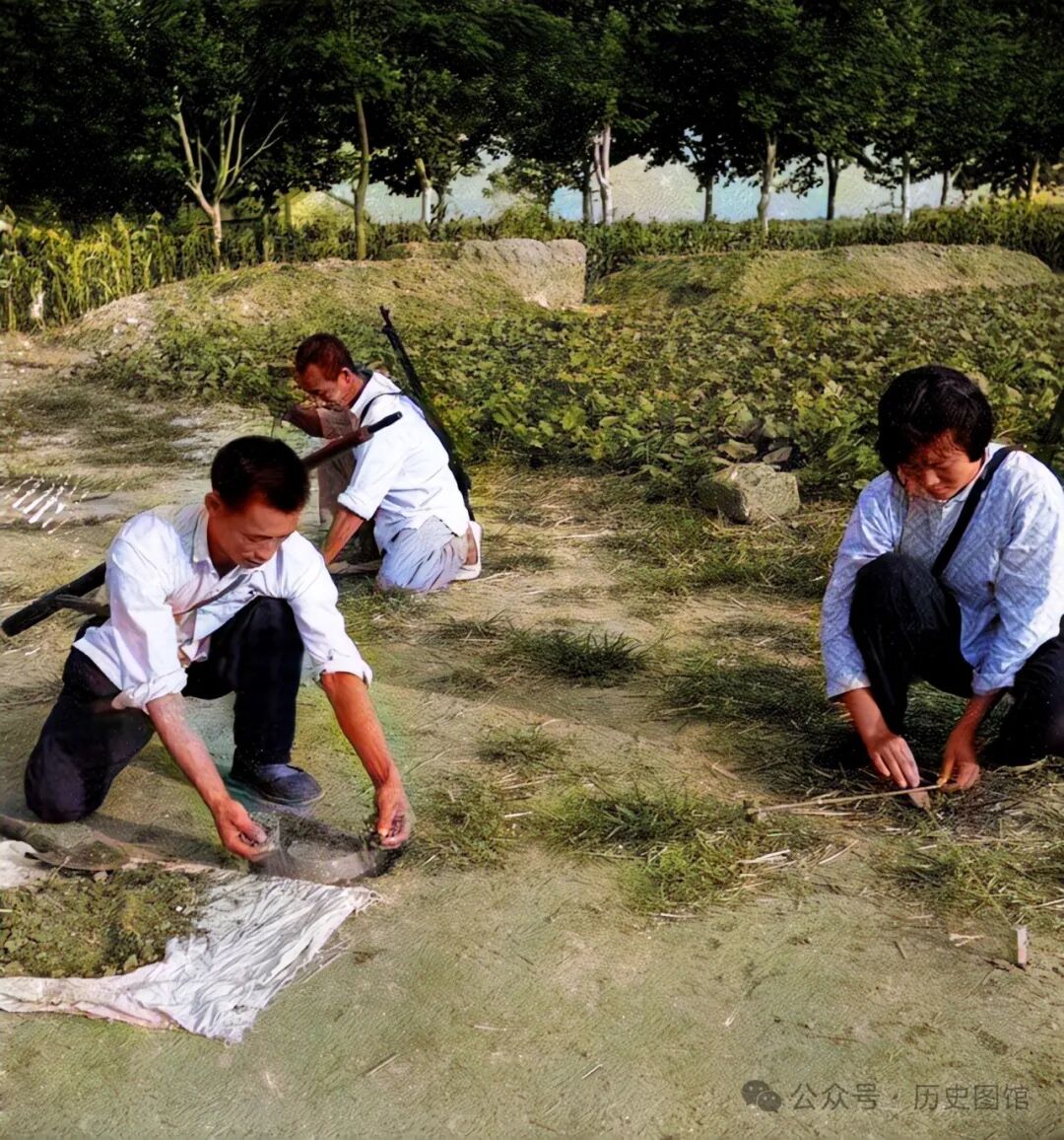1975年,河南辉县。在进入村子的一条必经之路上,三名民兵正在埋设地雷。