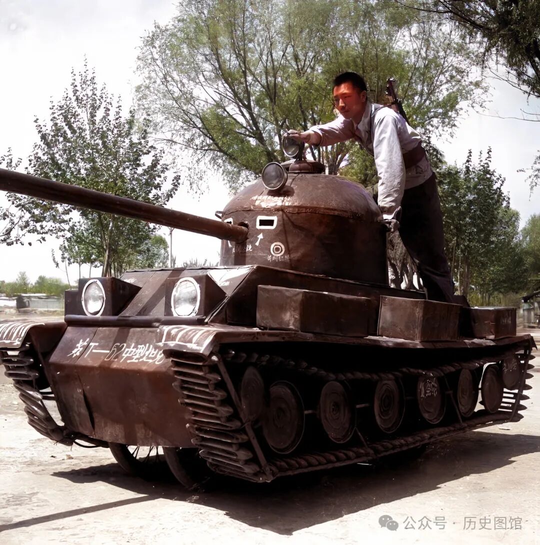 这其实是一辆山寨版坦克。它的尺寸要比真正的T-62小的多。履带是用织布机的梭子连接而成,坦克的轮子是找来的锅盖。驱动坦克前进的,是最下面的平板车轮子。