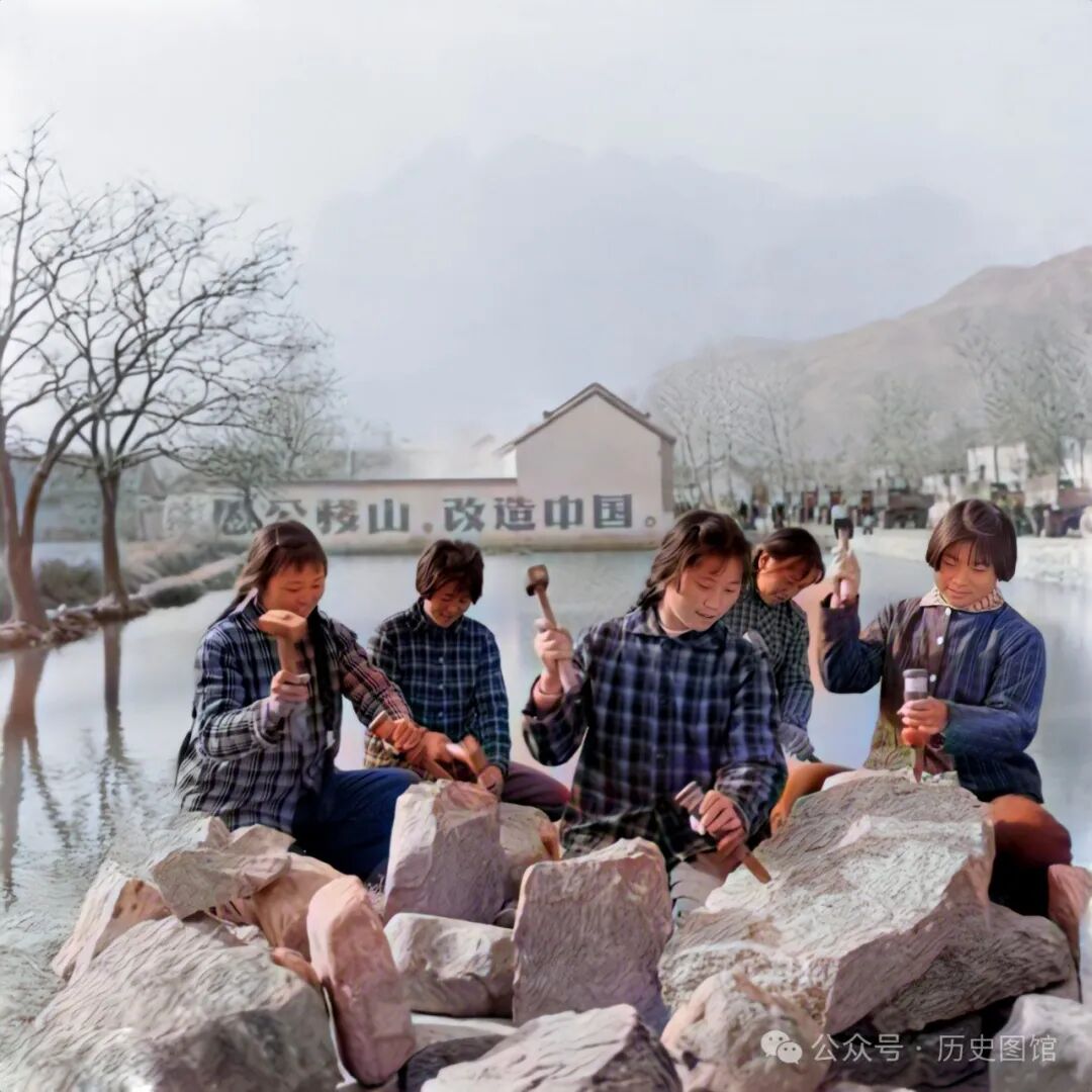 民兵,是不脱离生产的群众武装组织。在平时,她们放下枪,拿起农具积极参加生产建设。照片中这几名女青年,正拿着锤子和凿子,将大石头砸成小石头,建房铺路。
