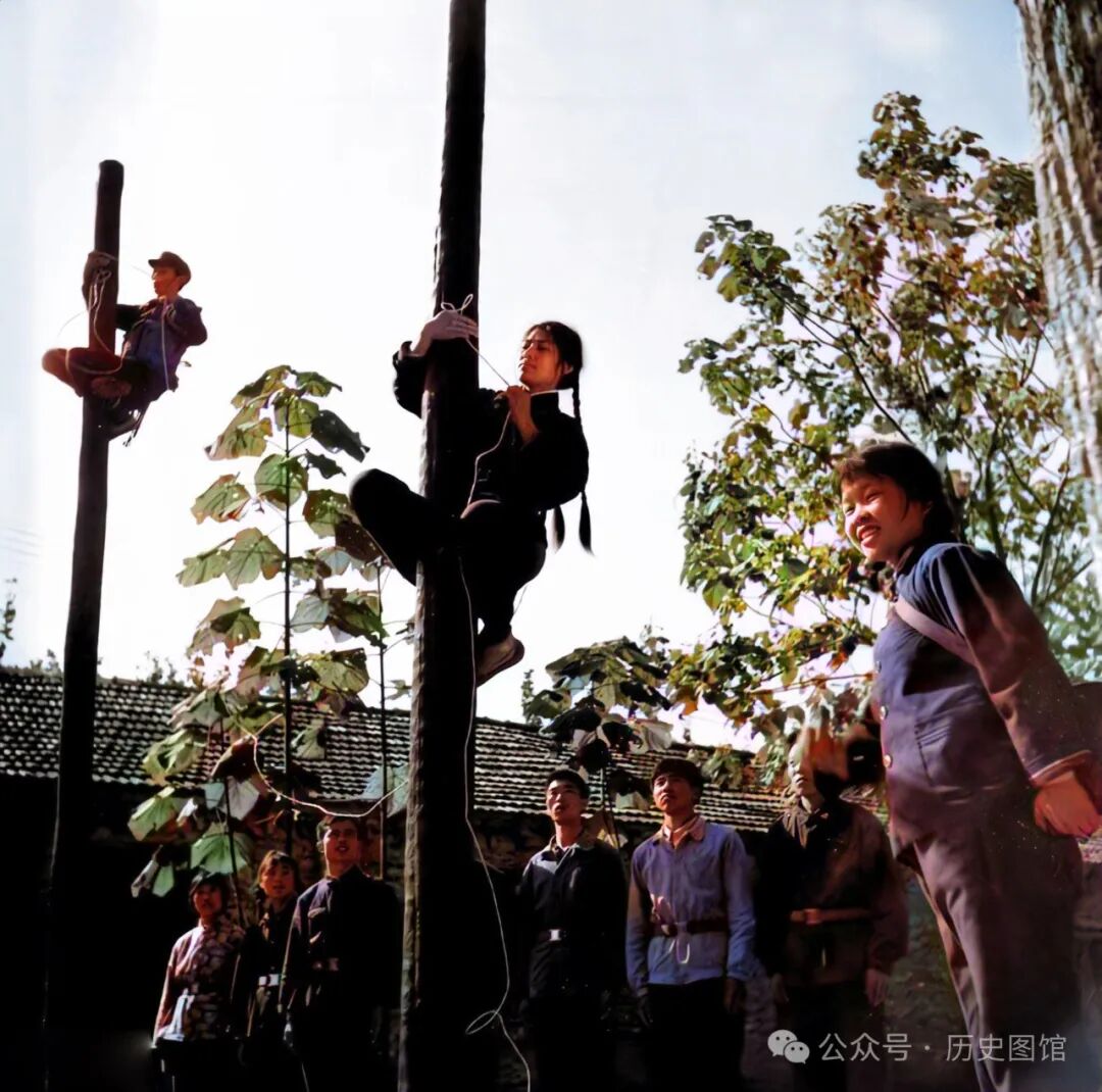 1975年,辉县一群民兵正在进行攀登固定训练。随着指挥员一声令下,一名男民兵和女民兵速速爬上树,并将绳子固定在上面。