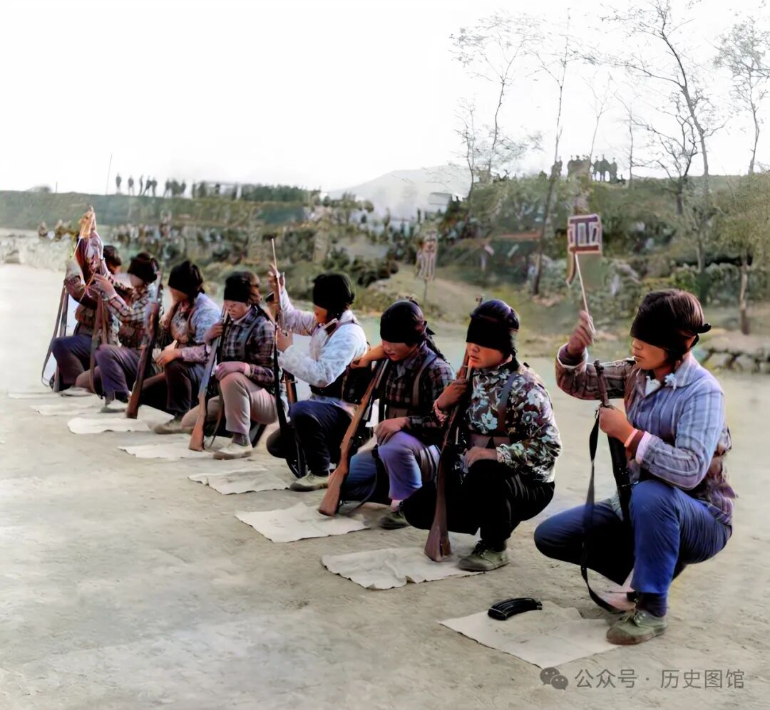 在河南辉县的一个靶场上,8名女民兵半蹲在地上,她们的眼睛被黑布蒙了起来。