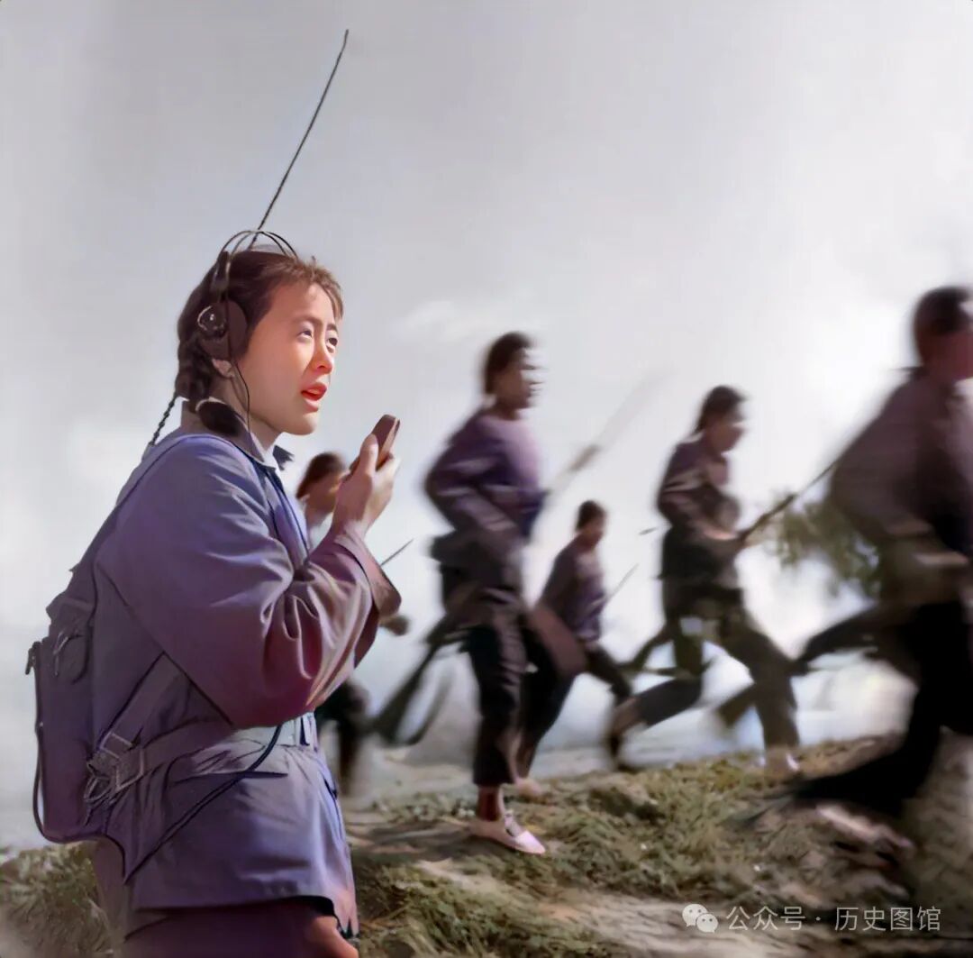 冲锋号响起,一群女青年端着上了刺刀的步枪跃出战壕,义无反顾地向前冲去。一名通讯员背着电台,大声向后方汇报阵地上情况。