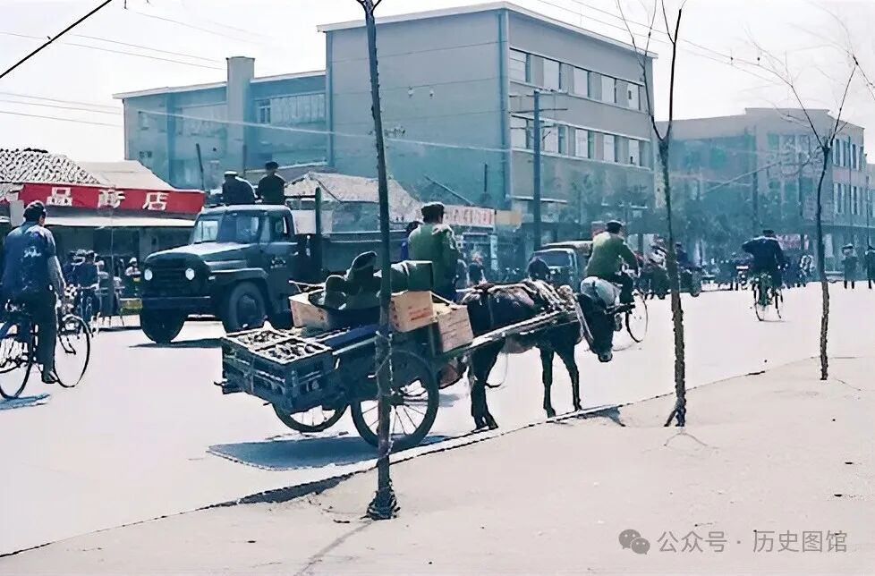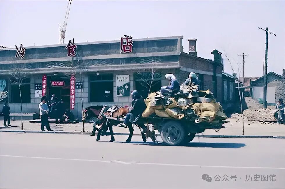 这张照片,拍摄于沈阳北行。街道宽阔笔者,一辆马车上装满了货物。街边是一家冷食店。