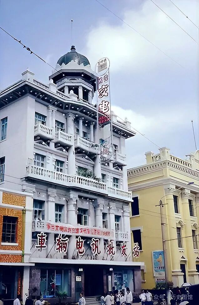 80年代,沈阳中街东风百货商店附近的街景。照片中这座白色的四层大楼,为当时的车辆电讯批发站。大楼外观白色,有人说这是五交化大白楼,其实不是。