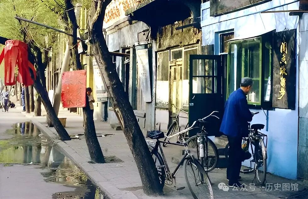 80年代,沈阳城内一条小街边景象。街道宽阔笔直,路边种植有柳树。沿街有一些小店铺,一名骑自行车的男子,正准备进入小饭馆吃饭。店门口的牌子上写着“闻香须留步”字样。