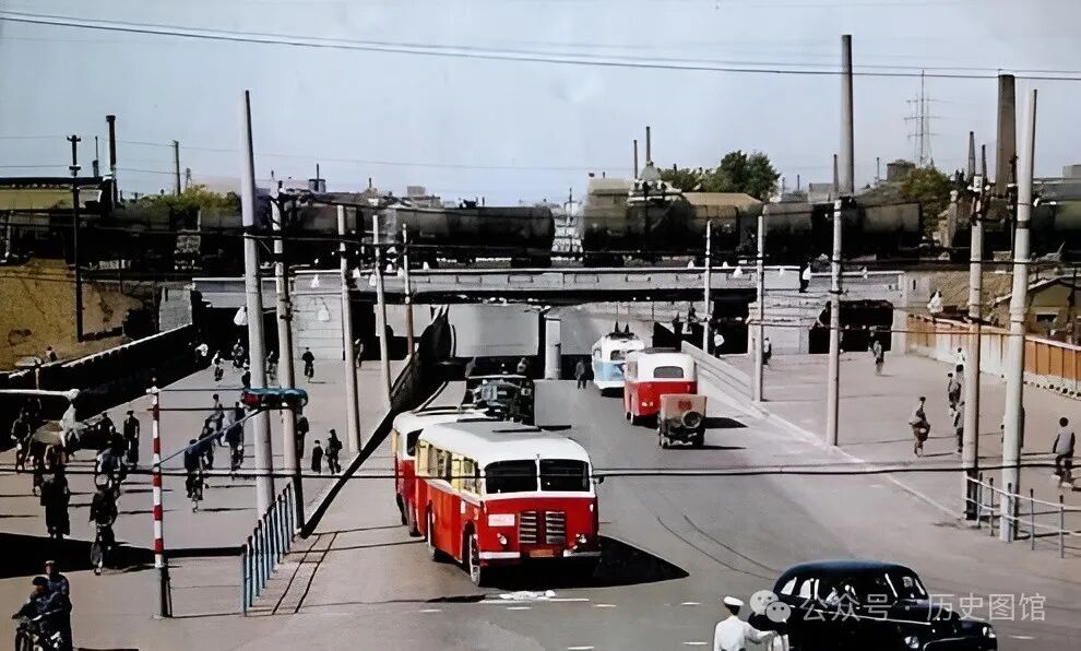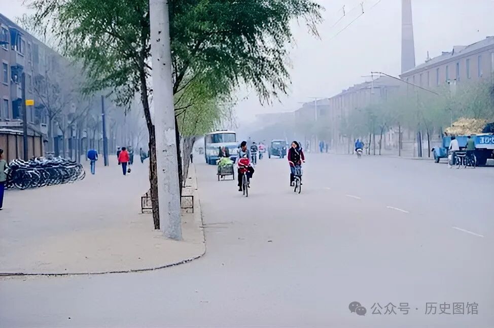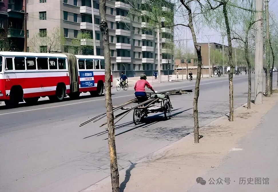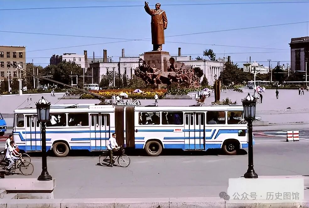 街道上,几辆长着“大辫子”的公共汽车停在路边,乘客正在上下车。据说当年电车月票1块5。大部分人骑着自行车出行,画面很有年代感。