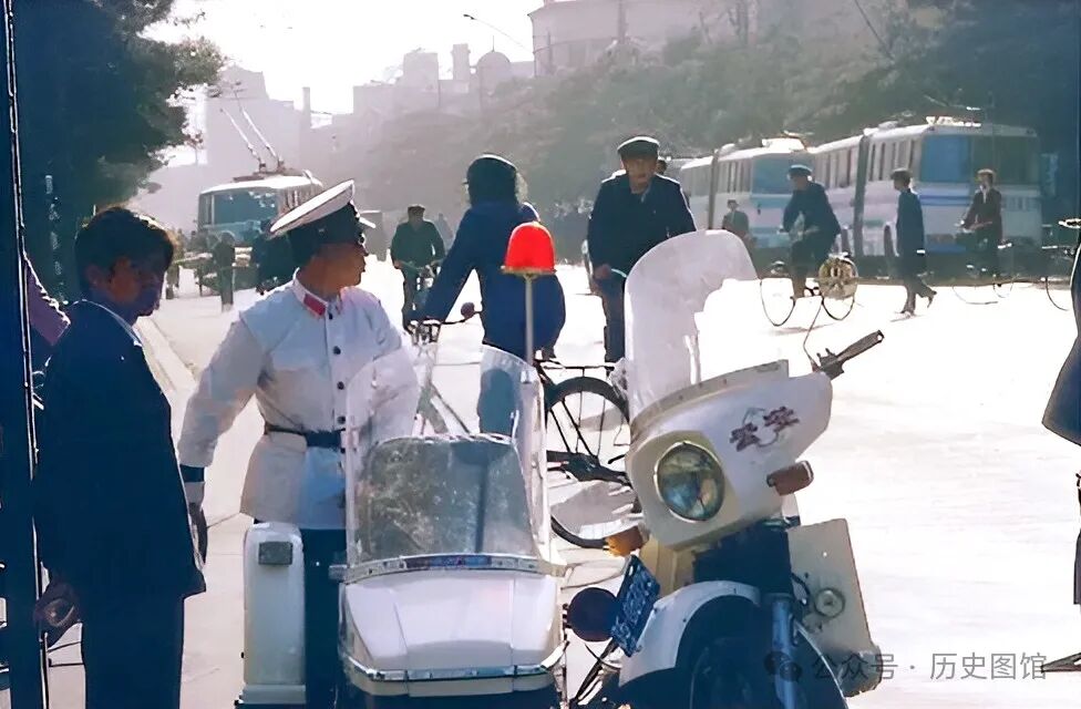 80年代的沈阳街头,身穿白色制服的公安,正在街头执勤。他们骑着白色的偏三轮,车尾竖有警灯。