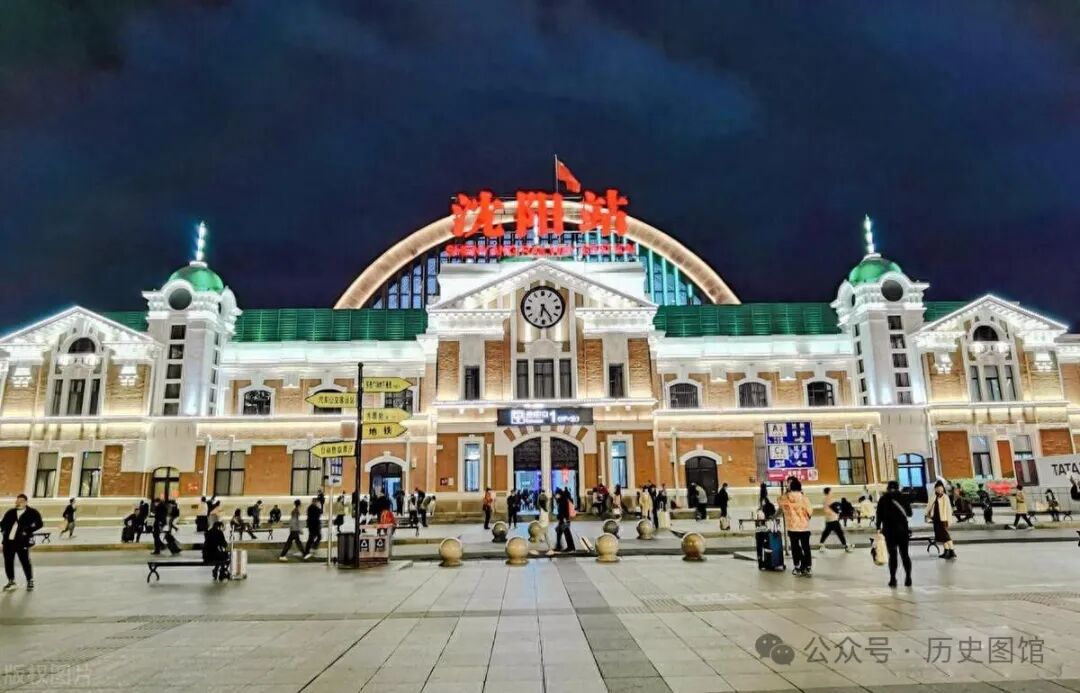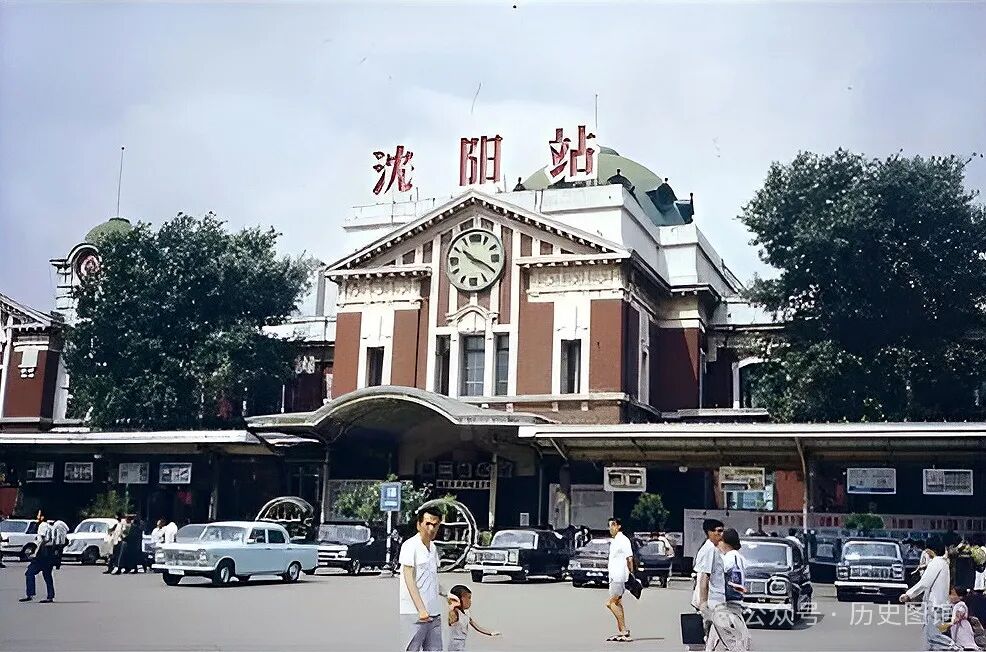 站前广场十分宽敞,门前停着不少汽车。沈阳站始建于1899年,当时在靠北位置。1910年才搬迁到这里。从那时起,近百年来,沈阳站建筑的外观几乎没有太大的变化