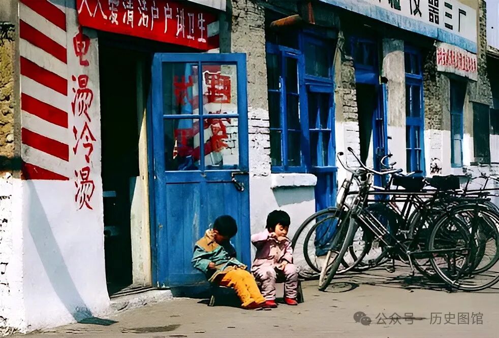 门口墙壁上写着“电烫、冷烫”字样。门头上方还悬挂着标语“人人爱清洁,户户讲卫生”。两个孩子坐在门口板凳上玩耍。