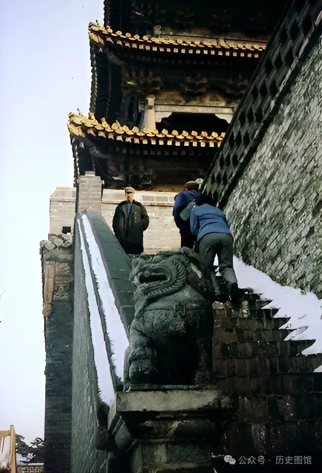 80年代的一个冬季,沈阳故宫里,几名游客正在登上凤凰楼。该楼建在4米多高的青砖台基上,巍峨壮观,为当时沈阳最高的建筑。