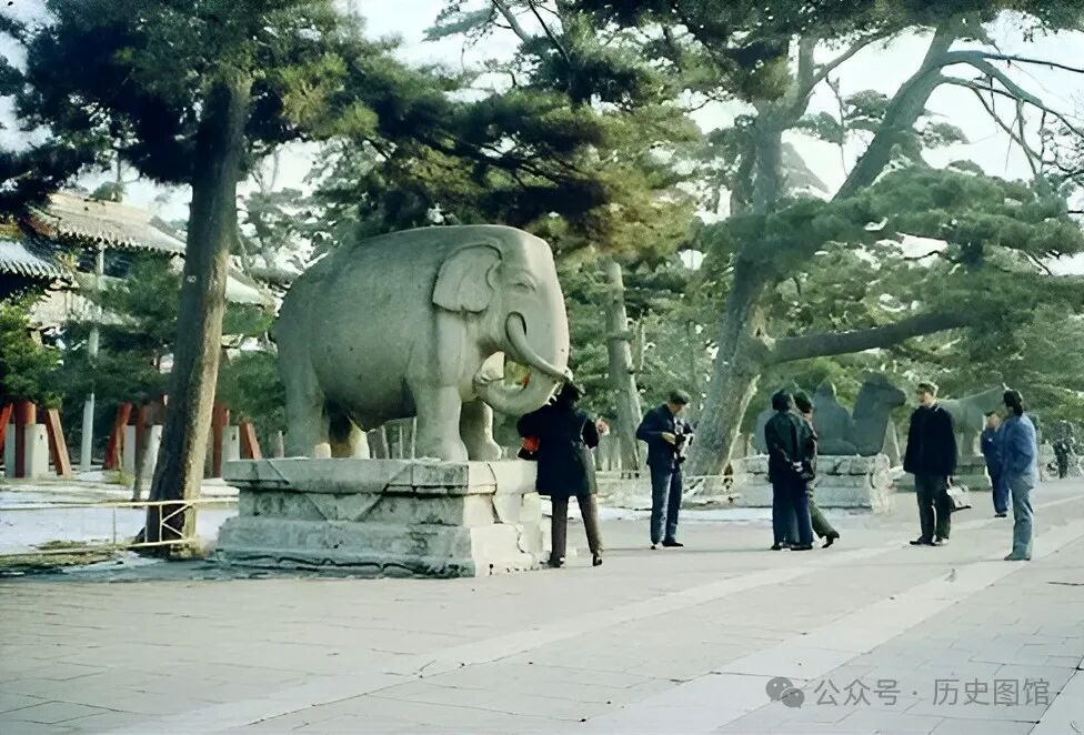 80年代,沈阳北陵公园里,几名游客们站在石象前拍照留念。北陵,本名“清昭陵”,是清朝第二代开国君主太宗皇太极以及孝端文皇后博尔济吉特氏的陵墓。