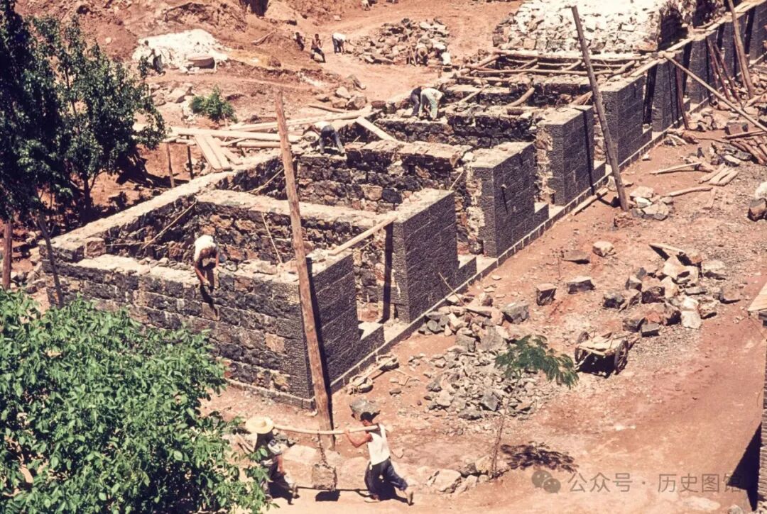 70年代,大寨村民正在修建房屋。墙壁用石头垒砌而成,屋顶是拱形。这种建筑十分坚固,冬暖夏凉。石头房子在当时的大寨很普遍。