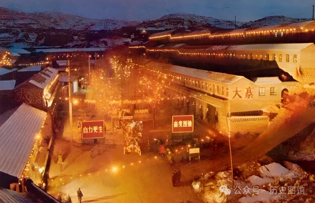 这是1970年代的大寨新村,大寨社员们住上了宽敞明亮的瓦房,生活条件有了质的飞越。墙壁上红色的“大寨”二字十分醒目。街道上有不少来大寨参观学习的代表团。
