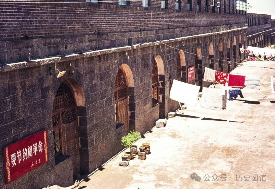 70年代,大寨公社村房屋。房屋为砖瓦结构,宽敞明亮。可见,社员们的住房条件有了很大改善。墙壁上写着巨大的标语。
