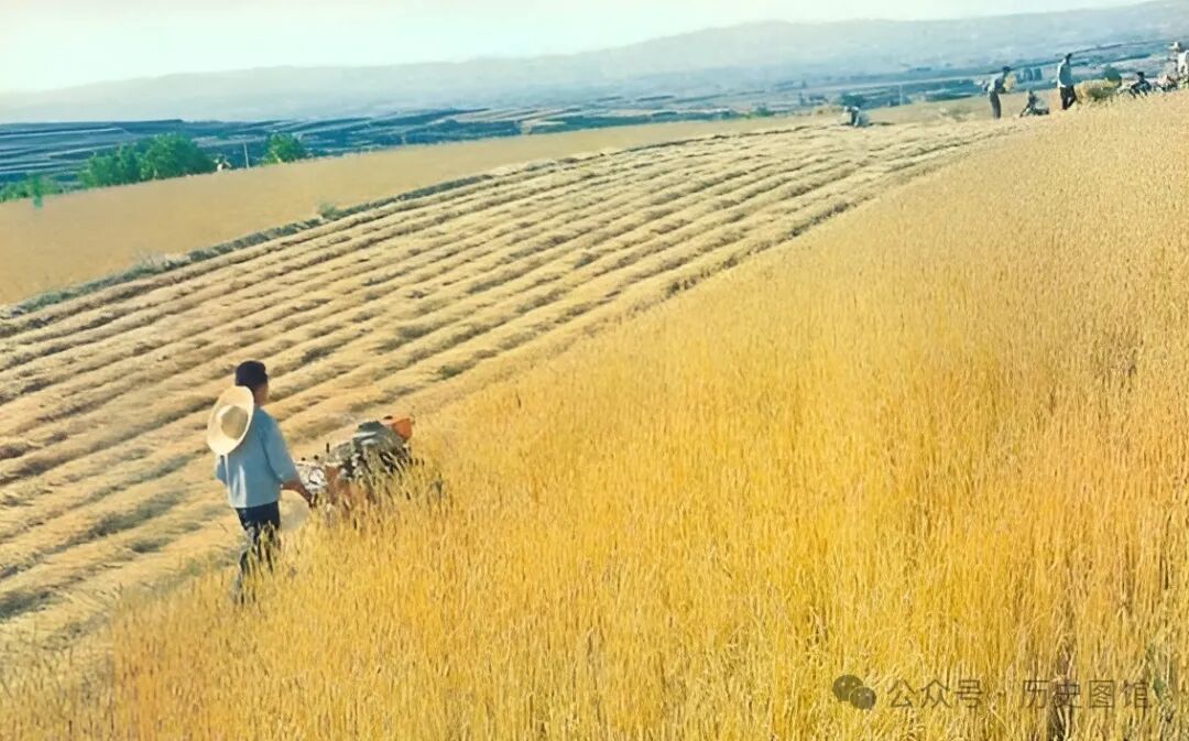 1970年,大寨的社员们用手扶式收割机收割成熟的麦子,提高了生产效率。在以前,社员们都是弯着腰用镰刀割麦的,耗费大量人力物力。
