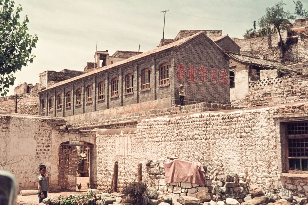 70年代,山西省昔阳县大寨村民们的房屋及农家院。房子墙壁用石头垒砌而成,有拱形的门洞。墙壁上挂着红色的标语。