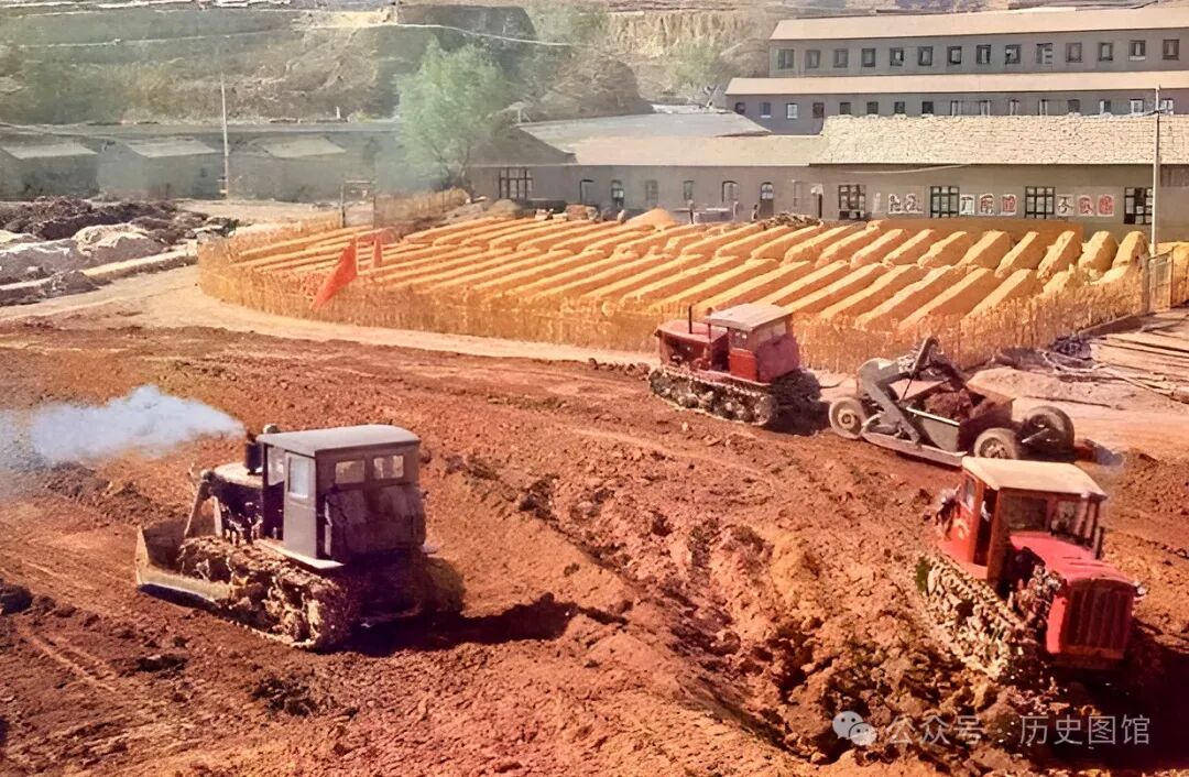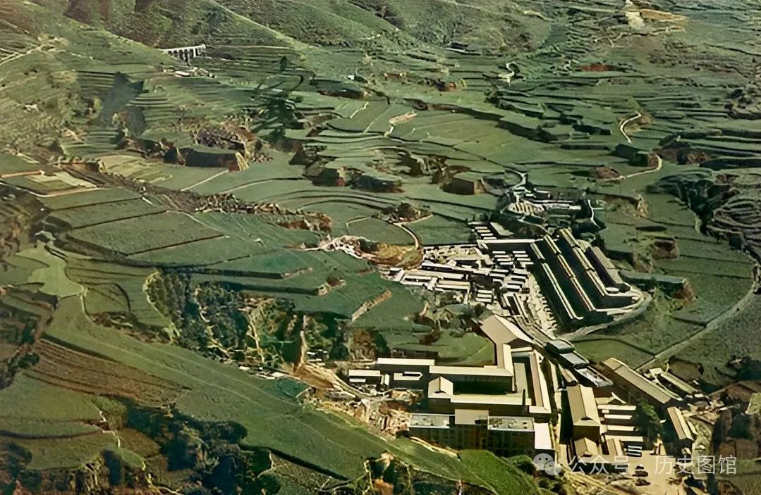 农业合作化之后,大寨村通过艰苦奋斗、自力更生,把深沟变成良田,坡地垒成梯田,实现了粮食大丰收。照片中那些圆形蓄水池叫“支农池”。