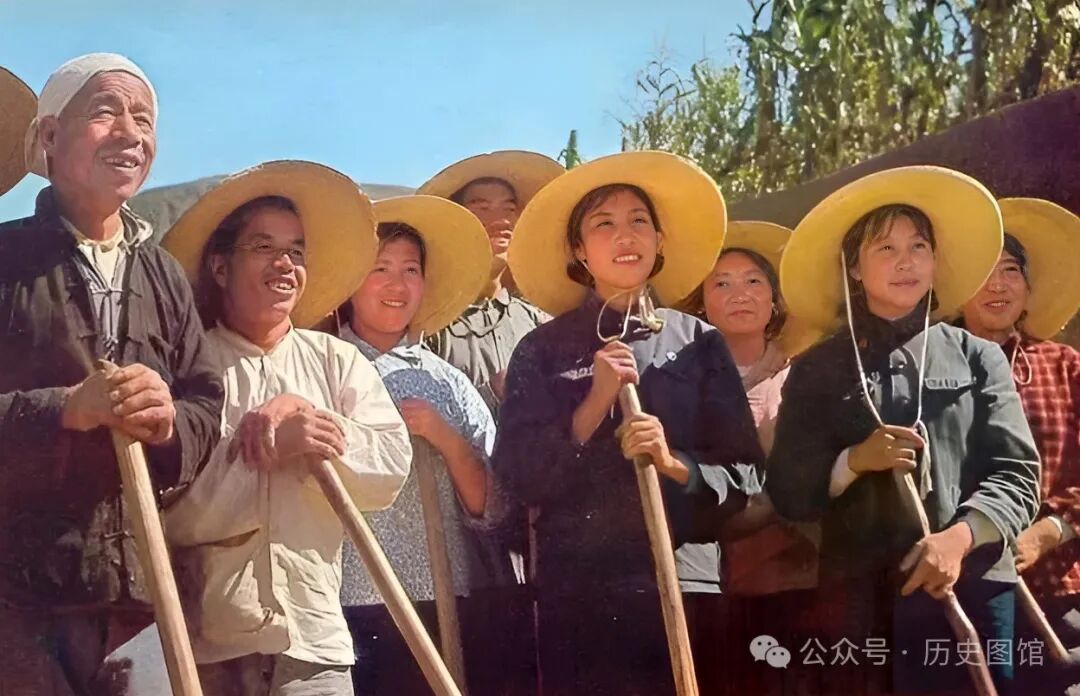 大寨公社的社员们,头戴草帽手拿农具,准备出发去地里干活。他们艰苦奋斗、自力更生,用自己的双手和汗水,将贫穷的大寨换了新颜。