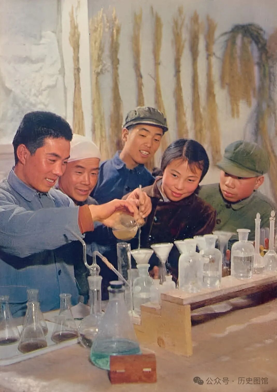 科学是第一生产力。照片中,大寨公社的农业技术员,正在实验室里调试药物制剂。科学育种,科学种田,粮食生产取得连年取得大丰收。