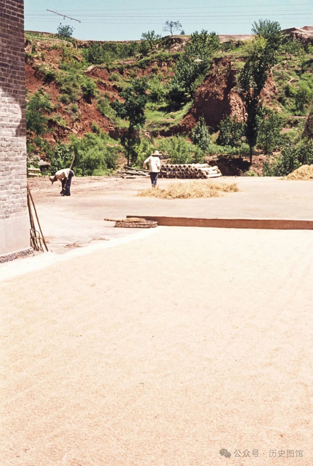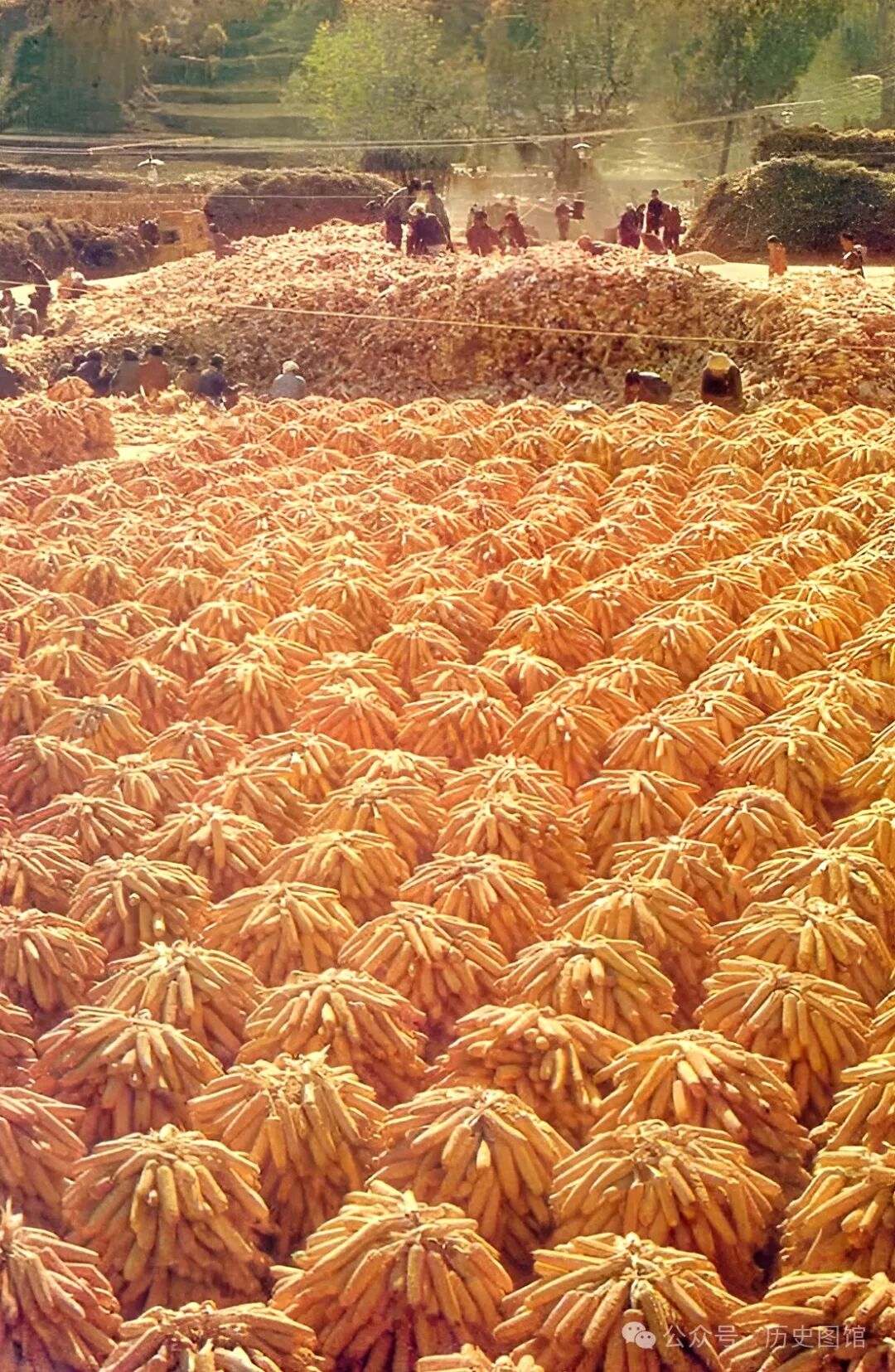 在大寨村的晒谷场上,人们将丰收的玉米平摊在水泥地上晾晒。大寨村社员通过艰苦奋斗、自力更生,使得大寨村实现了翻天覆地的变化,粮食生产连年取得大丰收。
