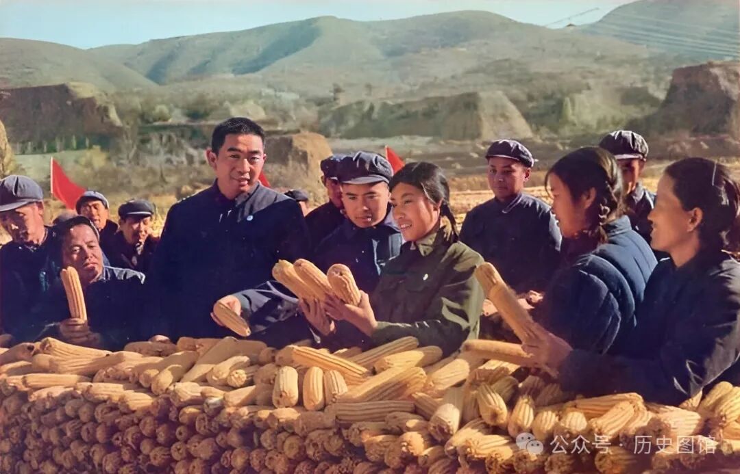 一支考察队来到大寨,正赶上秋季玉米大丰收。人们拿着沉甸甸的玉米棒,丰收的喜悦洋溢在人们的脸上。