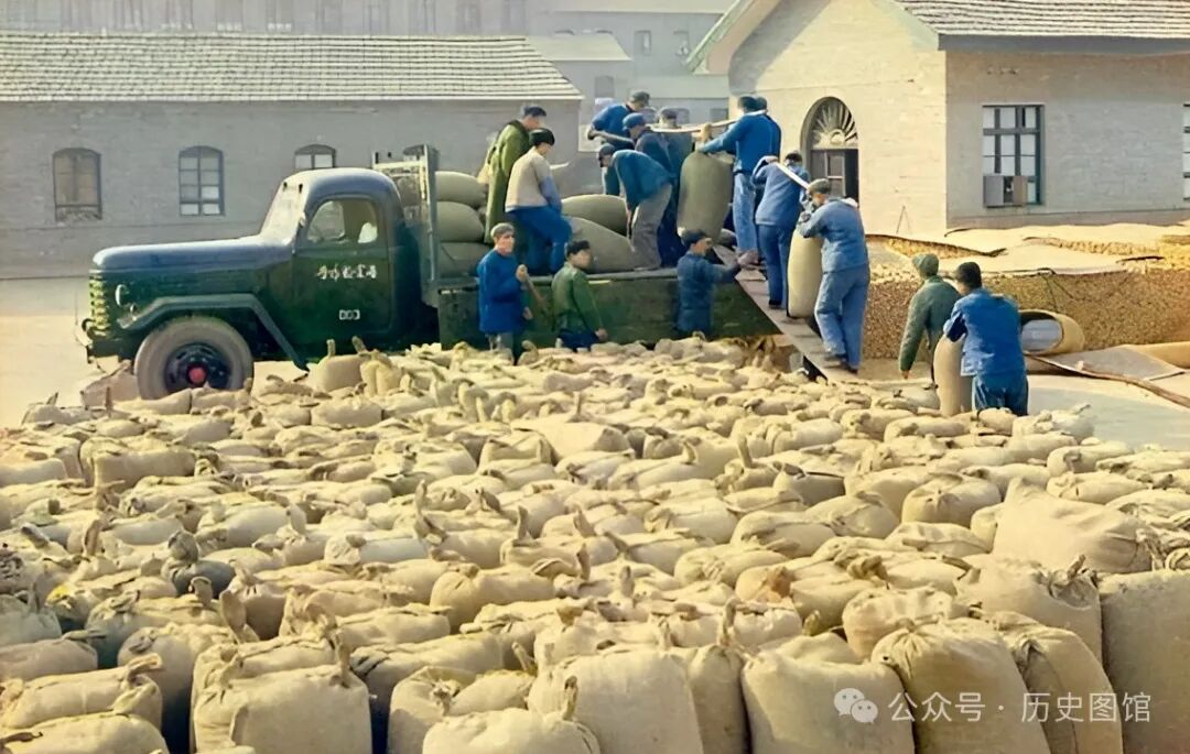 70年代,大寨粮食仓库大院里,整齐地码放着装有玉米的麻袋。人们抬着麻袋,往大解放卡车装。又是一个丰收年!