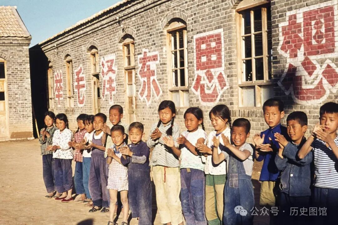 大寨村的小学校里,孩子们站在教室前面,鼓掌欢迎考察队的到来。孩子们上课的教室宽敞明亮,墙壁上书写着标语。