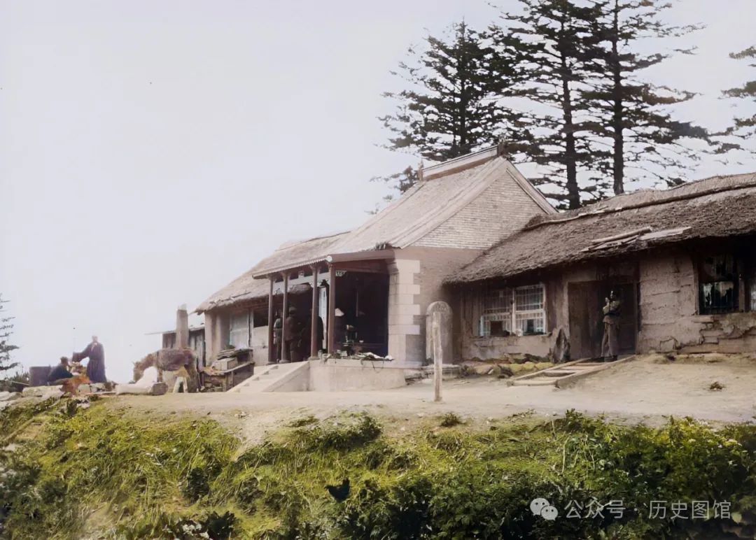这张照片,也是拍摄于老爷岭上。几栋房屋,像是一座寺庙,墙边立着一通石碑。当时的老爷岭,人迹罕至,有广袤的林海雪原,也是土匪、马贼出没的地方。