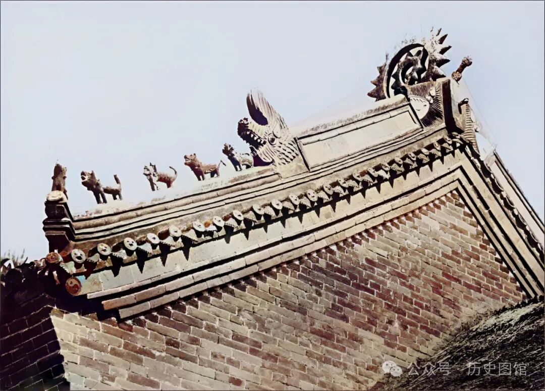关帝庙建筑的屋脊,修建得很复杂,有太阳造型、龙的造型,斜坡上装饰着几只造型各异的神兽雕像。可见,这座关帝庙的规格很高。