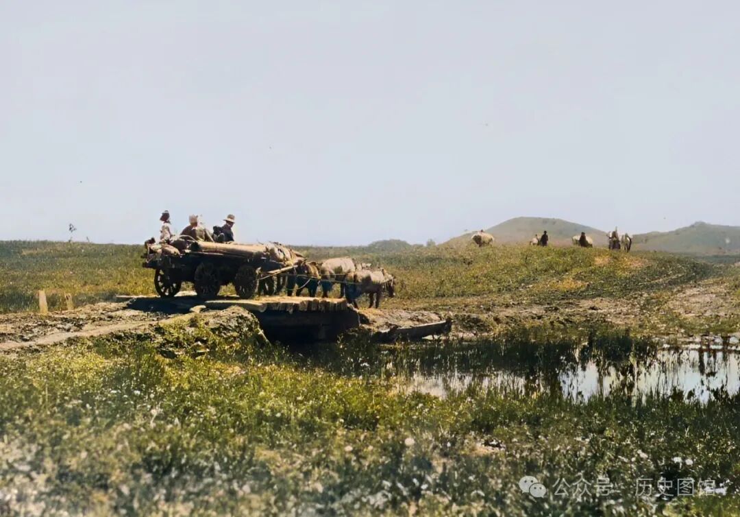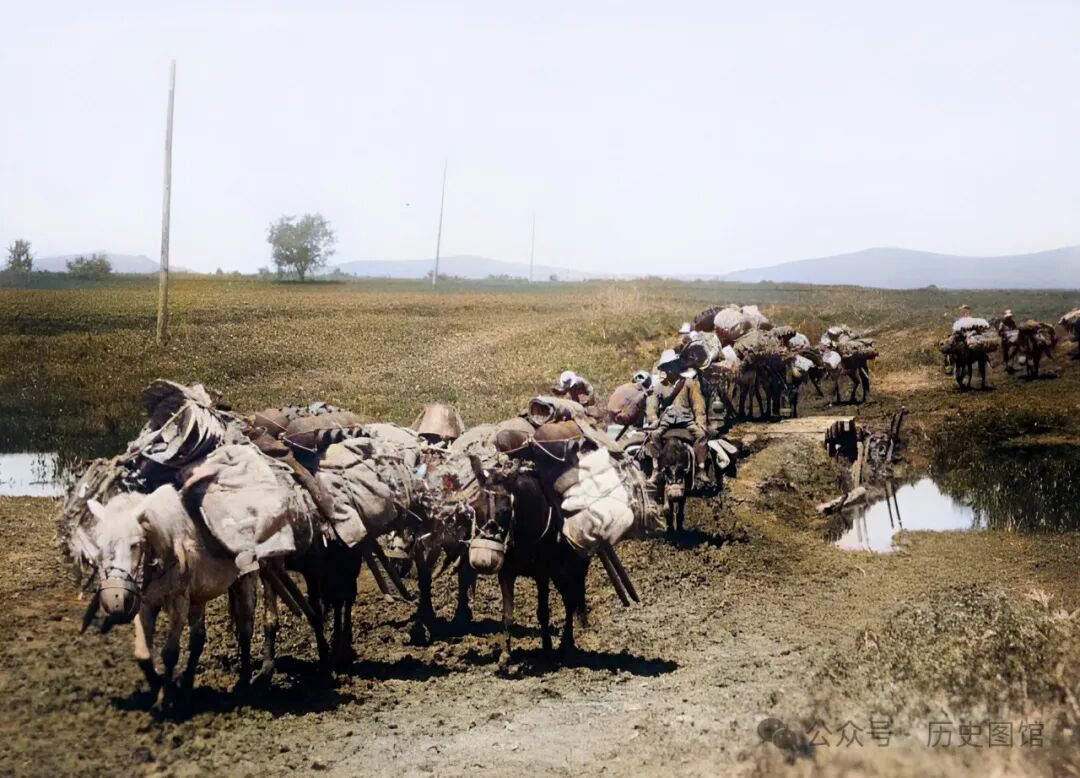 十几匹马的背上,都驮满了沉重的货物,有几个马夫跟在旁边。在过去,马匹是最主要的交通和运输工具。照片里,小桥的旁边是一望无际的农田,看上去很空旷。