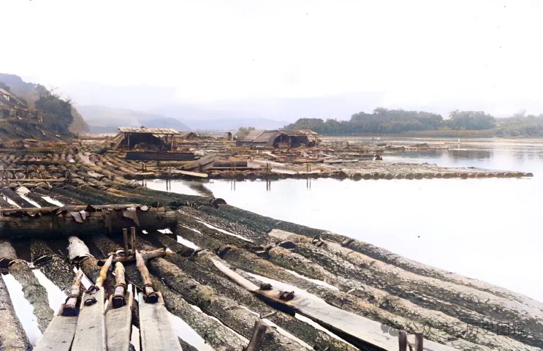 这张照片,拍摄于松花江上游的阿什哈达。江面上漂浮着从山上砍伐下来的木材组成的木筏,木筏上建有木屋,放排人居住在里面。如此众多的木筏顺流而下,看上去很是壮观。