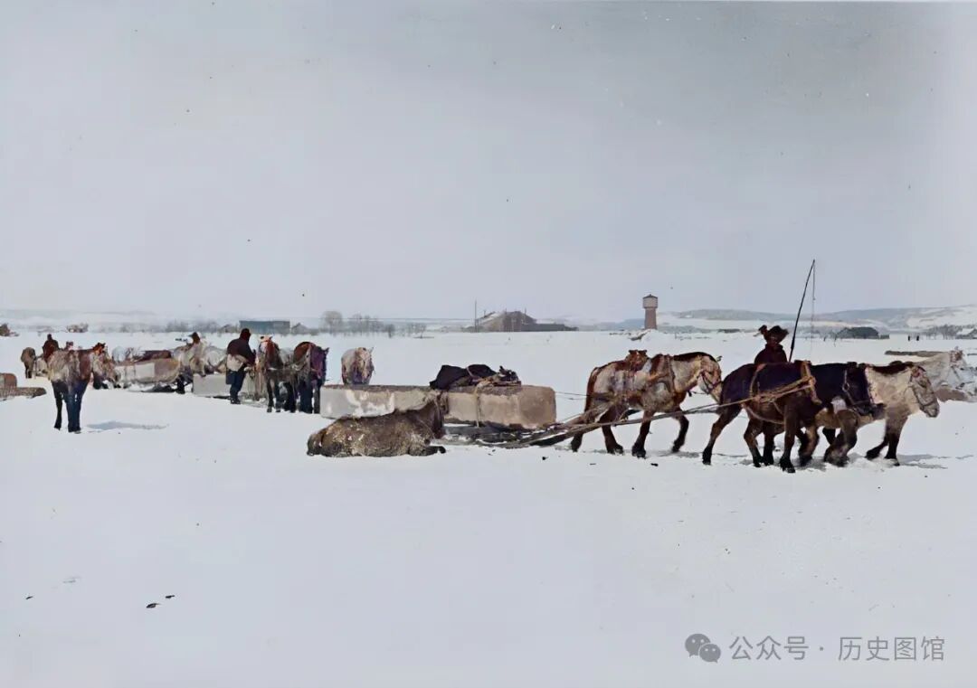 牡丹江边,人们将加工好的木材,放在雪橇上,由马匹拖到岸边,再装上火车运往全国各地。四匹马拖着一根巨大的方木,马夫手里拿着马鞭,甩得啪啪响。这样的画面,现在已经很难再见到了。