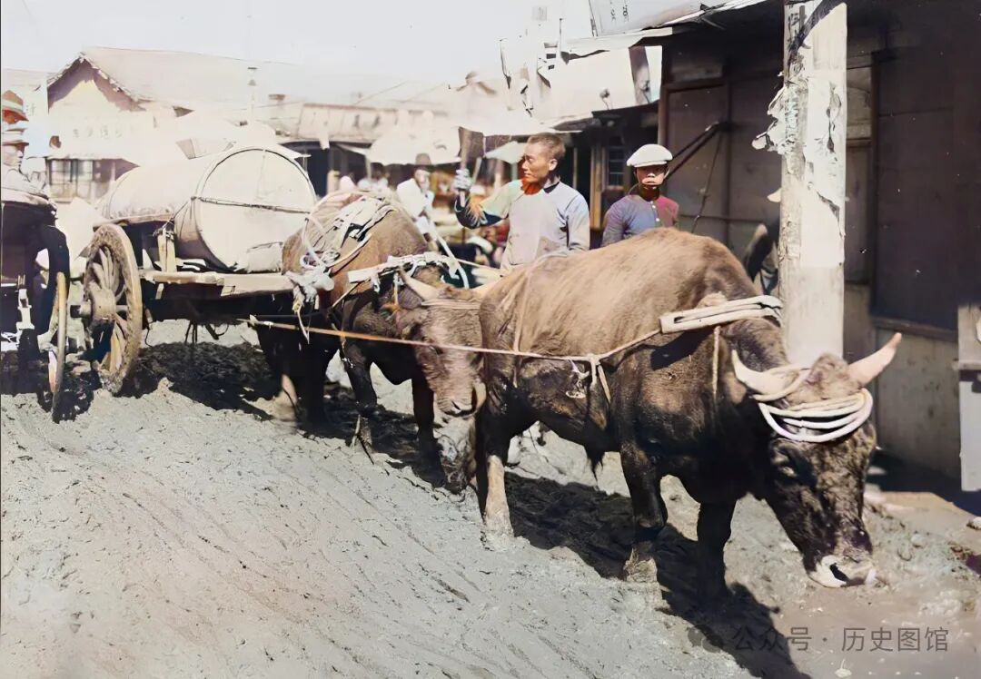 1932年,吉林敦化城内一条大街上,一名车夫赶着牛车,平板车上装着一只铁皮水桶,水桶上部有方形的开口,可以往里面注水。原来,他赶着牛车到城里卖水。旁边一辆黄包车上,一名军人扭头看着牛车。