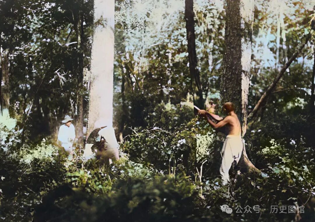 三名伐木工人正在密林里工作,他们用斧子和大锯,将成材的树木砍伐下来。当时,生产力落后,电锯很少,主要还是靠人力砍伐树木。伐木工的工作是很辛苦的。