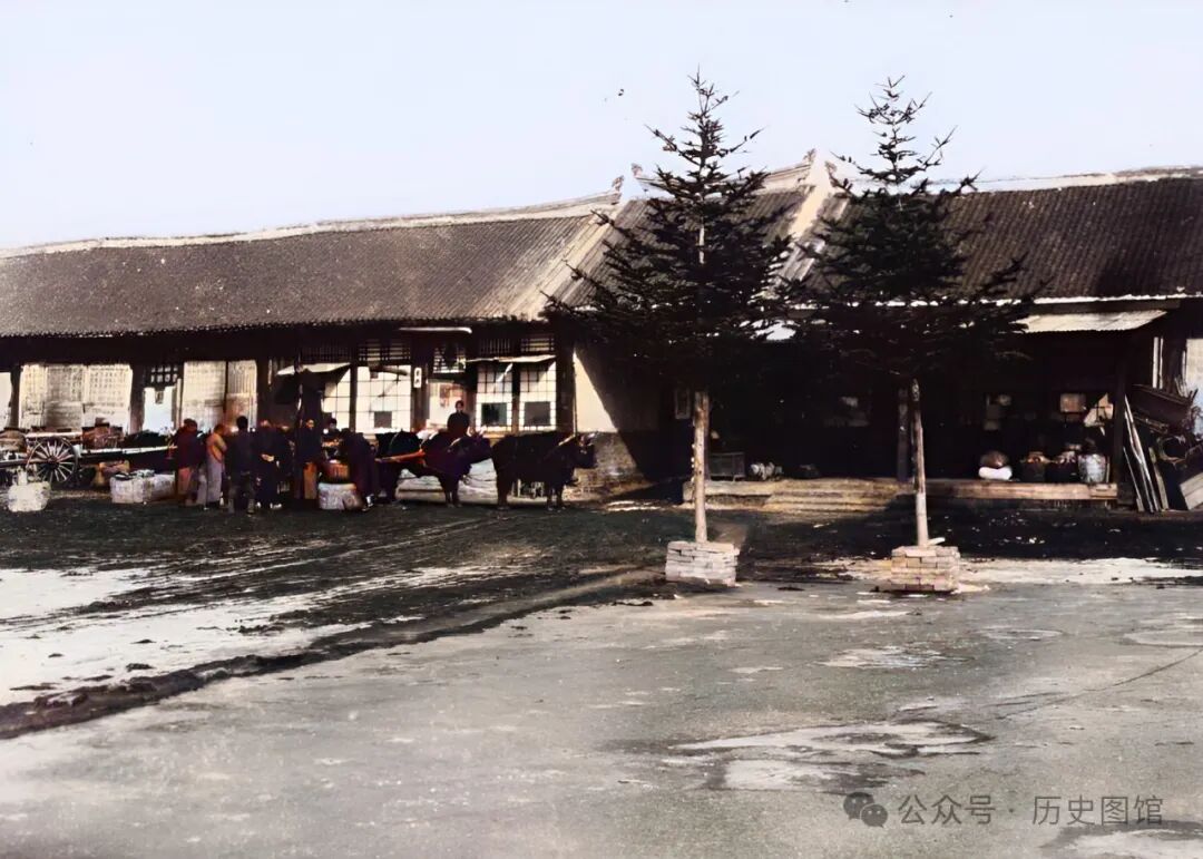 30年代,吉林敦化郊外,一座商铺前景象。客栈门口停着几辆牛车,它们都是前来批发采购年货的。有的牛车上,已经装满了酒坛。还有的小贩,在店铺门口挑选商品,生意相当火爆。而旁边那一家店铺,却是生意冷清,门可罗雀。
