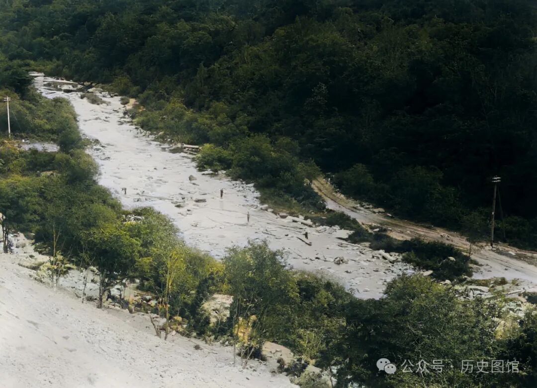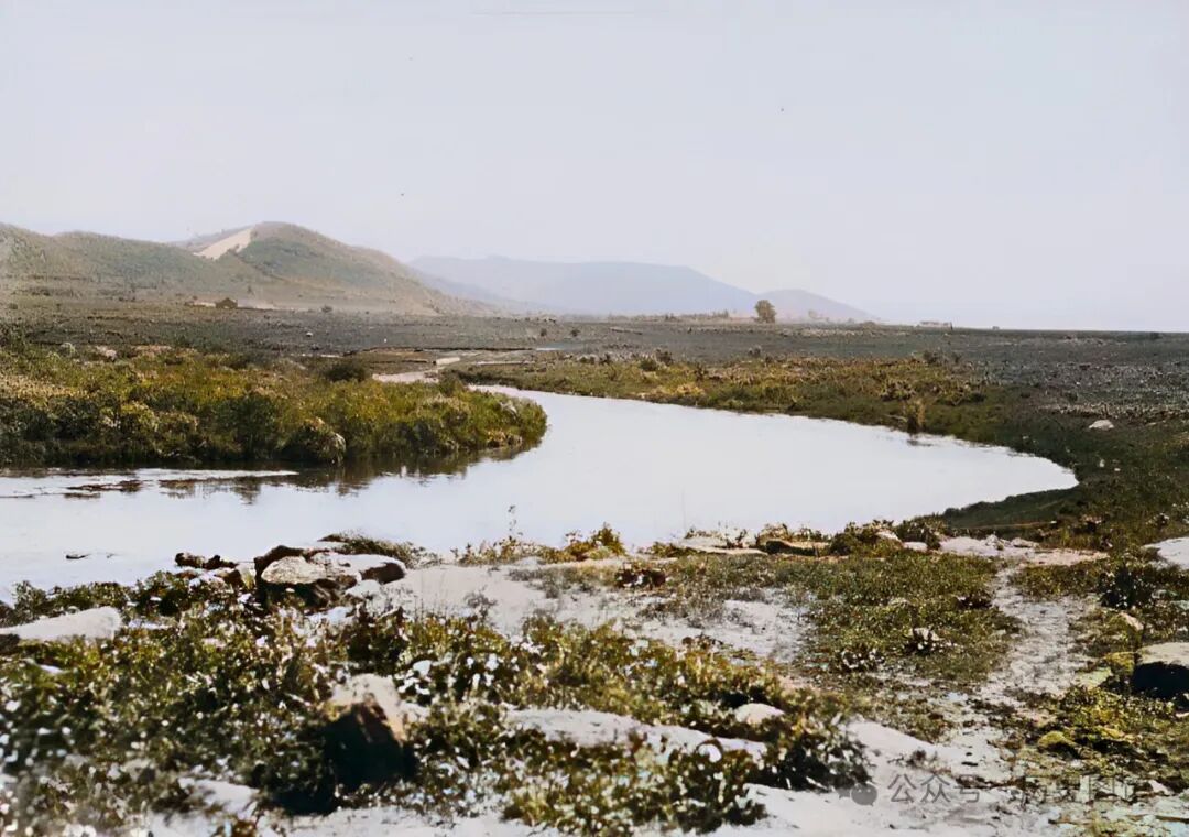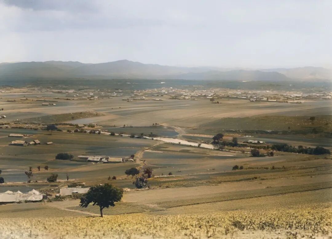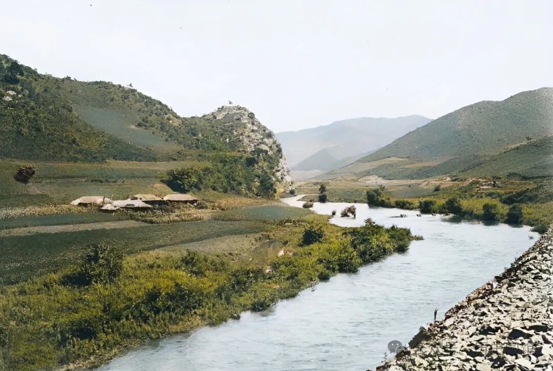 这张照片,拍摄于敦图铁路线附近的五虎顶子地带。这里山清水秀风光旖旎。一条溪流在山谷间穿行,应该是依兰河。河道两侧是大面积的农田,其间点缀着一些房舍。远处,青山连绵不绝。照片拍摄于1933年。