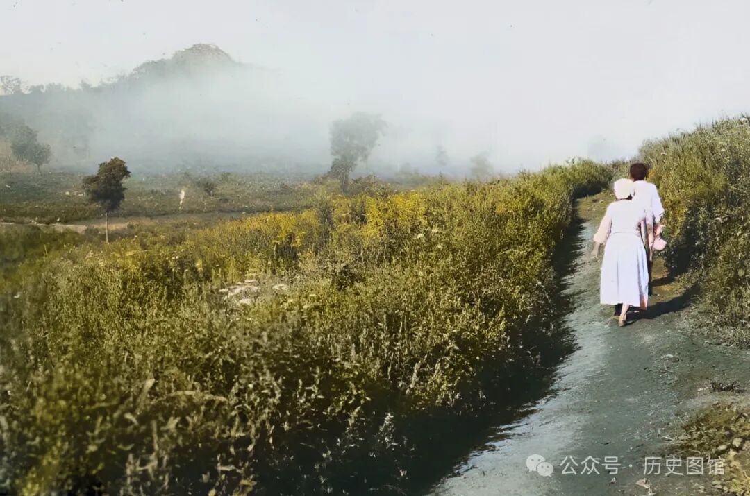 1933年,哈尔巴岭风貌。照片中,两名当地人从一条山路上走过。哈尔巴岭,位于敦化县。是牡丹江上游与布尔哈通河的分水岭。