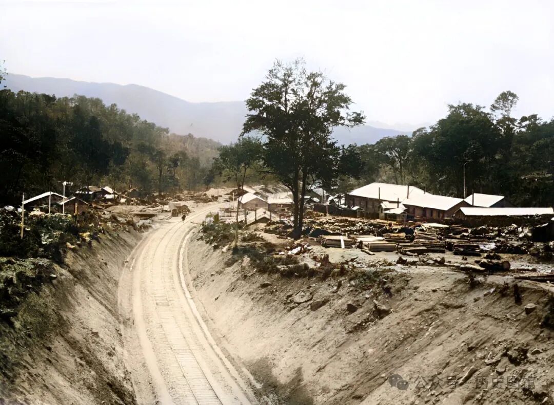 1933年,老爷岭上,一座铁路隧道西出口附近景象。铁路线附近,分布着一些房屋,是货物集散地。房前的空地上,堆放着很多原木。等待装上火车,运往全国各地。远处,青山连绵不绝。