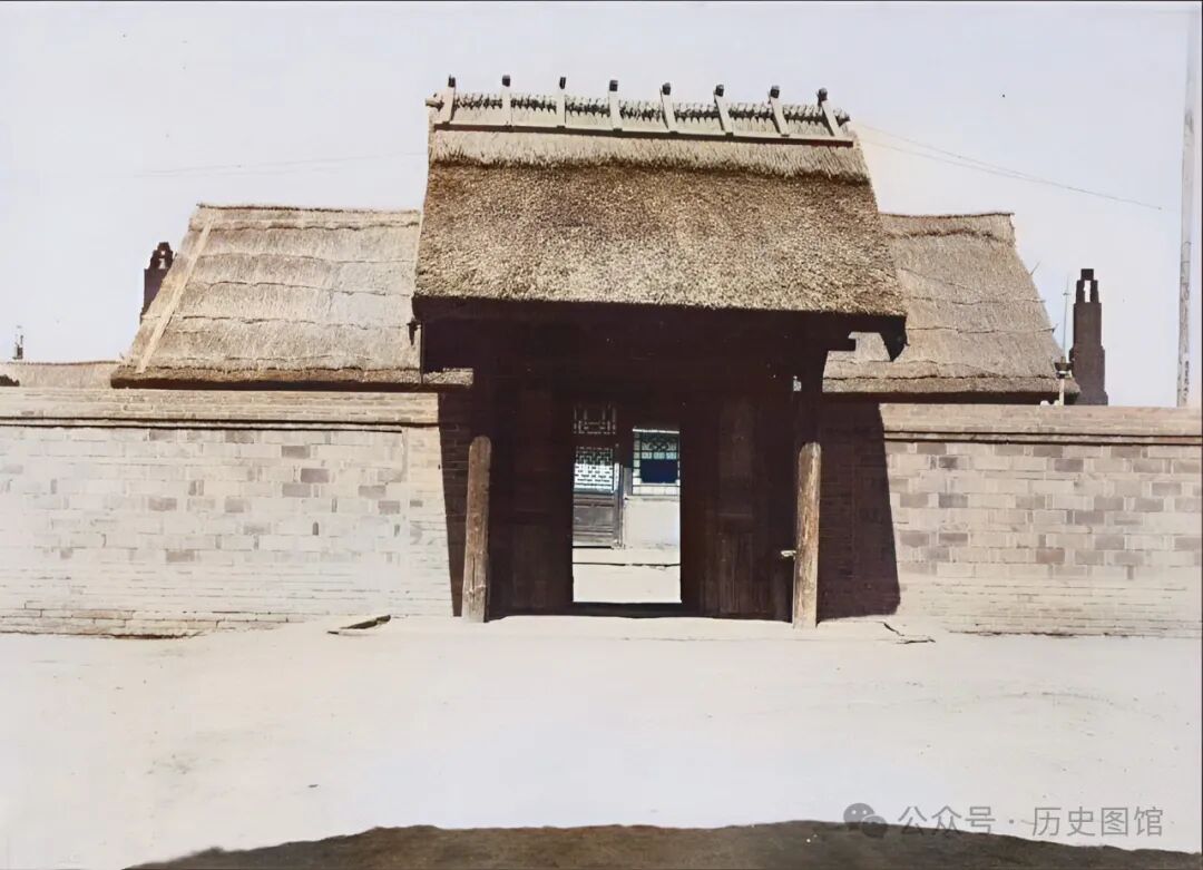 30年代,敦化郊外一户满族人家的院落。院子不大,是个四合院。透过大门能看到正屋的房门。院子的门楼,设计得很独特。斜坡上覆盖的不是瓦,而是覆修葺整齐的秸秆屋顶。