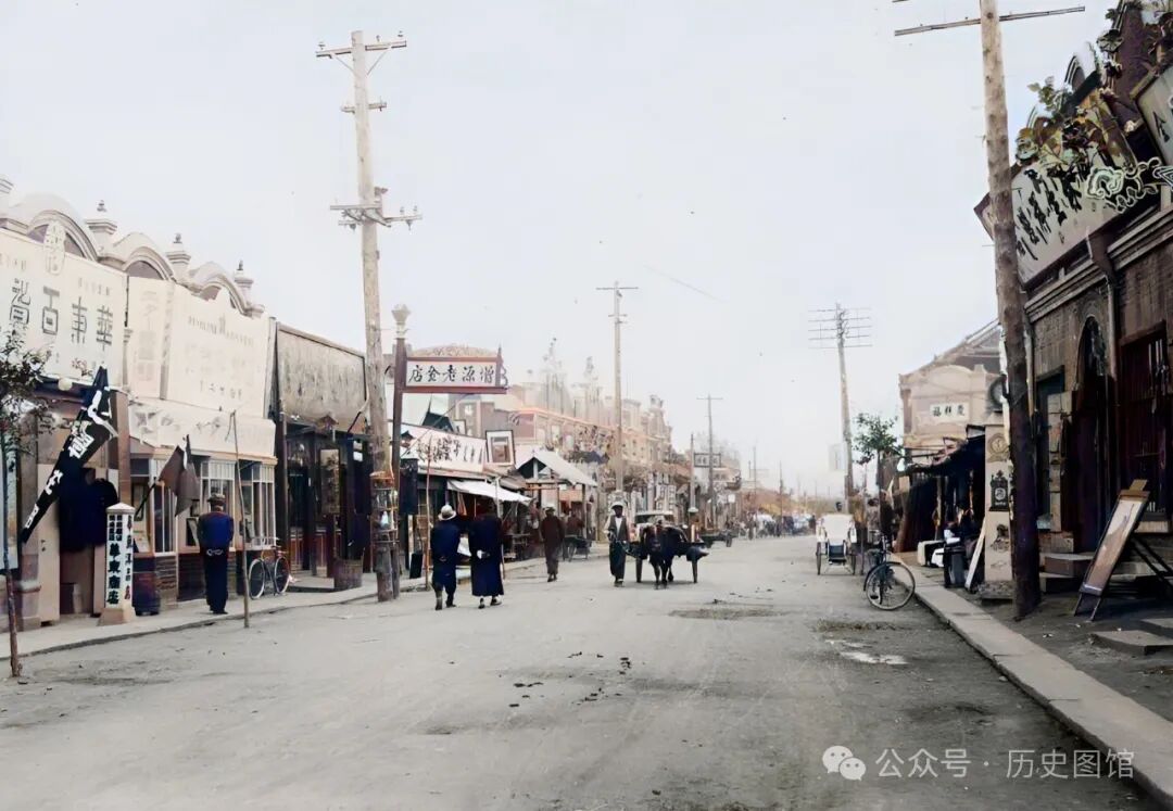 这是一条古老的街道,马路两侧建筑古色古香,沿街店铺都在开门营业,广告牌子琳琅满目。街上行人不是很多,能看到马车、黄包车和自行车,画面很有年代感。