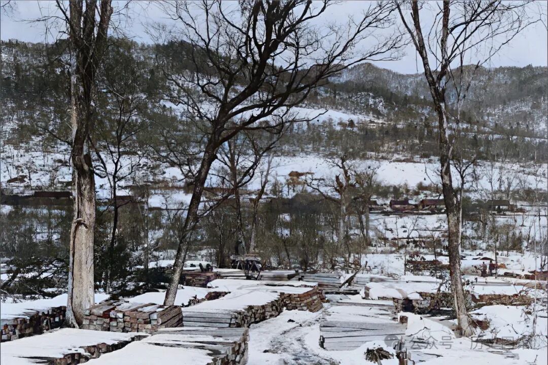 1932年冬,吉林敦化老爷岭景象,大雪封山,到处一片银装素裹。近处的地面上,整齐码放着制作好的铁道枕木。仔细看,不远处的山坡上有一条铁路线。附近有不少房屋,像是一个小镇。