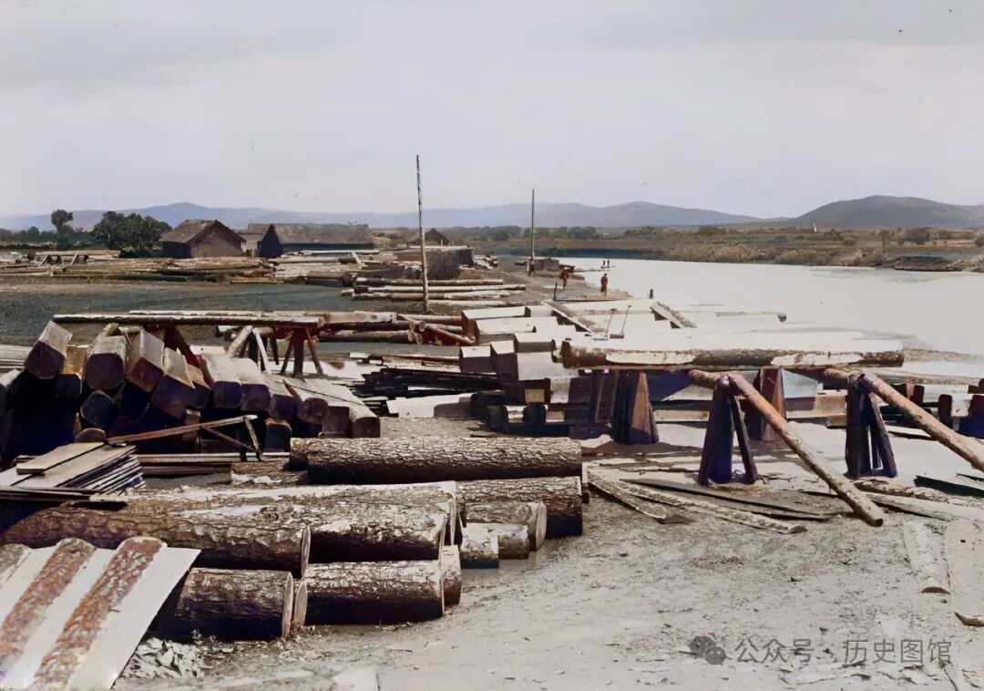 这是位于牡丹江上游的一处木材加工场。空地上堆满了原木。上游漂流下来的木材,在这里进行切割加工,然后再运往全国各地。