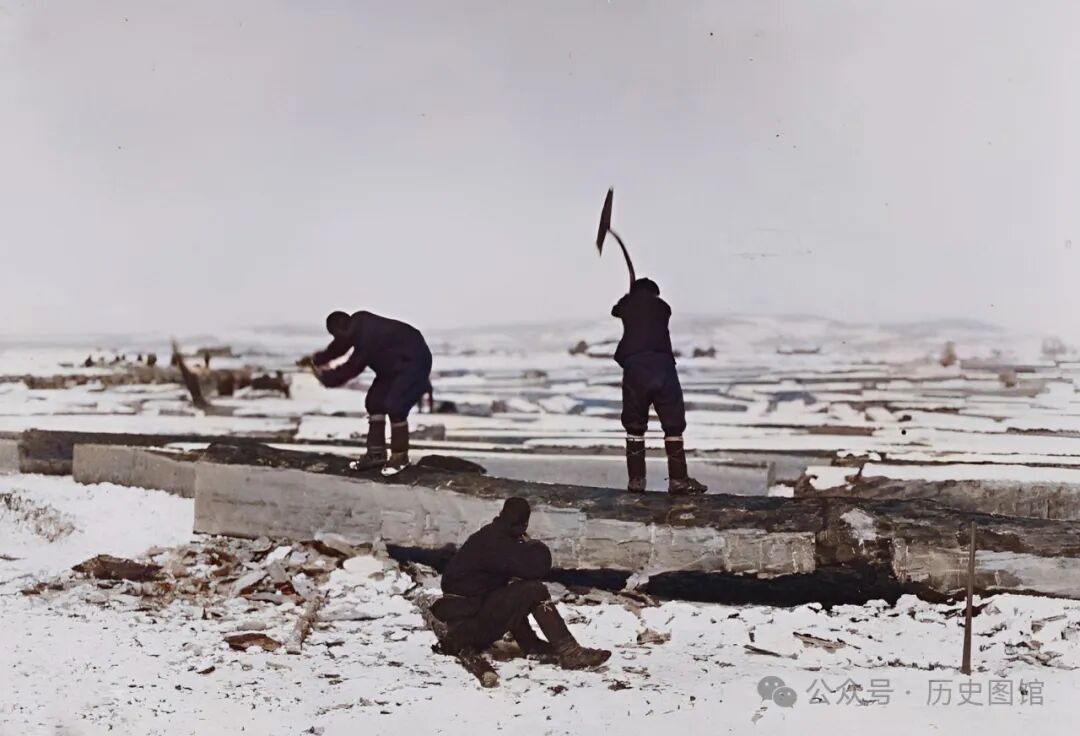 1932年,吉林敦化牡丹江边,几名工人正在加工木材。他们用铁镐,将圆木加工成方木,便于运输。这些木材,是从江水中捞出。地上的积雪还没有融化,江面上漂浮的木头也覆盖着白雪。