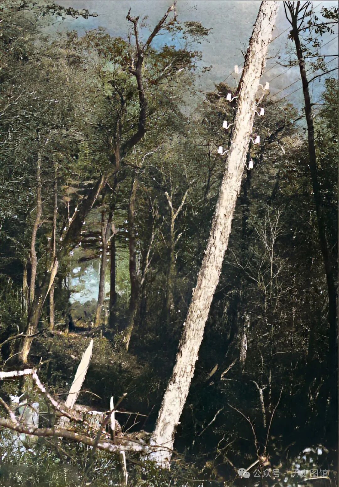 这张照片,拍摄于威虎岭。照片中,在密林深处倾斜着一根木制电线杆。由此判断,附近有人居住或者是伐木场。