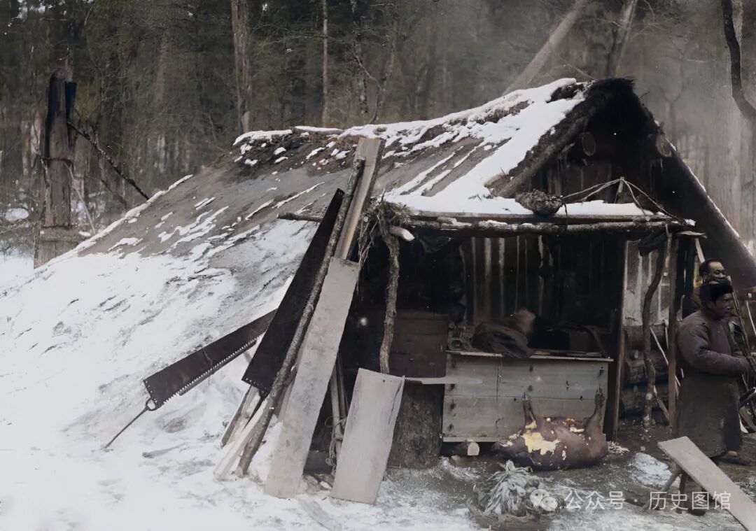 1932年,吉林敦化威虎岭,林间一块空地上,有一建神秘小屋。这是一座木制的窝棚。这里居住者几名伐木工人。几只大锯斜靠在我窝棚上,几名伐木工人站在窝棚前聊天。房檐下挂着一只野猪。