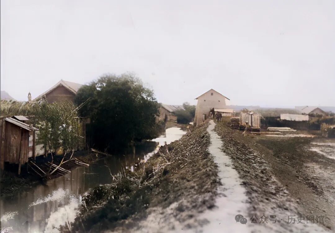 30年代,敦化郊外,有一座寨墙。寨墙由土筑成,墙外有注满水的壕沟,主要是为了防范土匪的侵扰。不远处,在寨墙上修建有碉楼。照片中,寨墙顶部已经被人们踩出了一条小路。