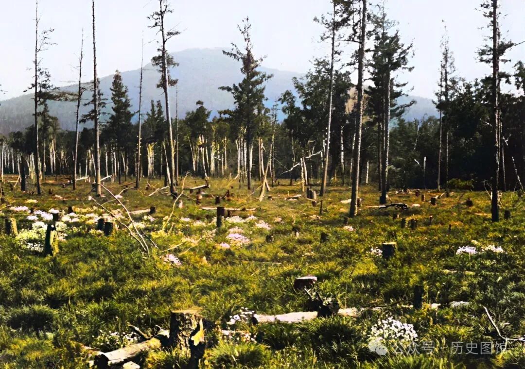 1932年,老爷岭上一处被砍伐后的林区。大树被砍伐运走了,留下了一些还没有成材的小树。