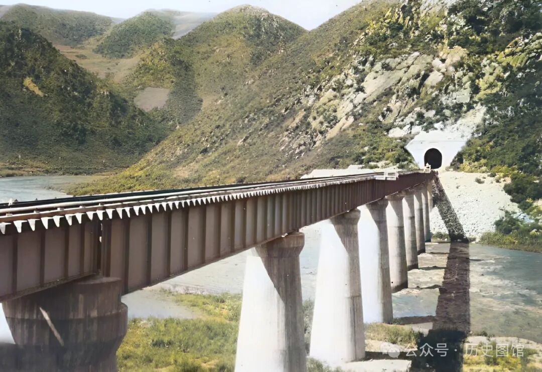 1933年,敦图铁路线16号桥景象,大桥尽头是第八隧道口。敦图铁路,从自敦化至延吉图们,全长191公里。1932年,分三段同时开工。1933年,敦图铁路全线竣工。