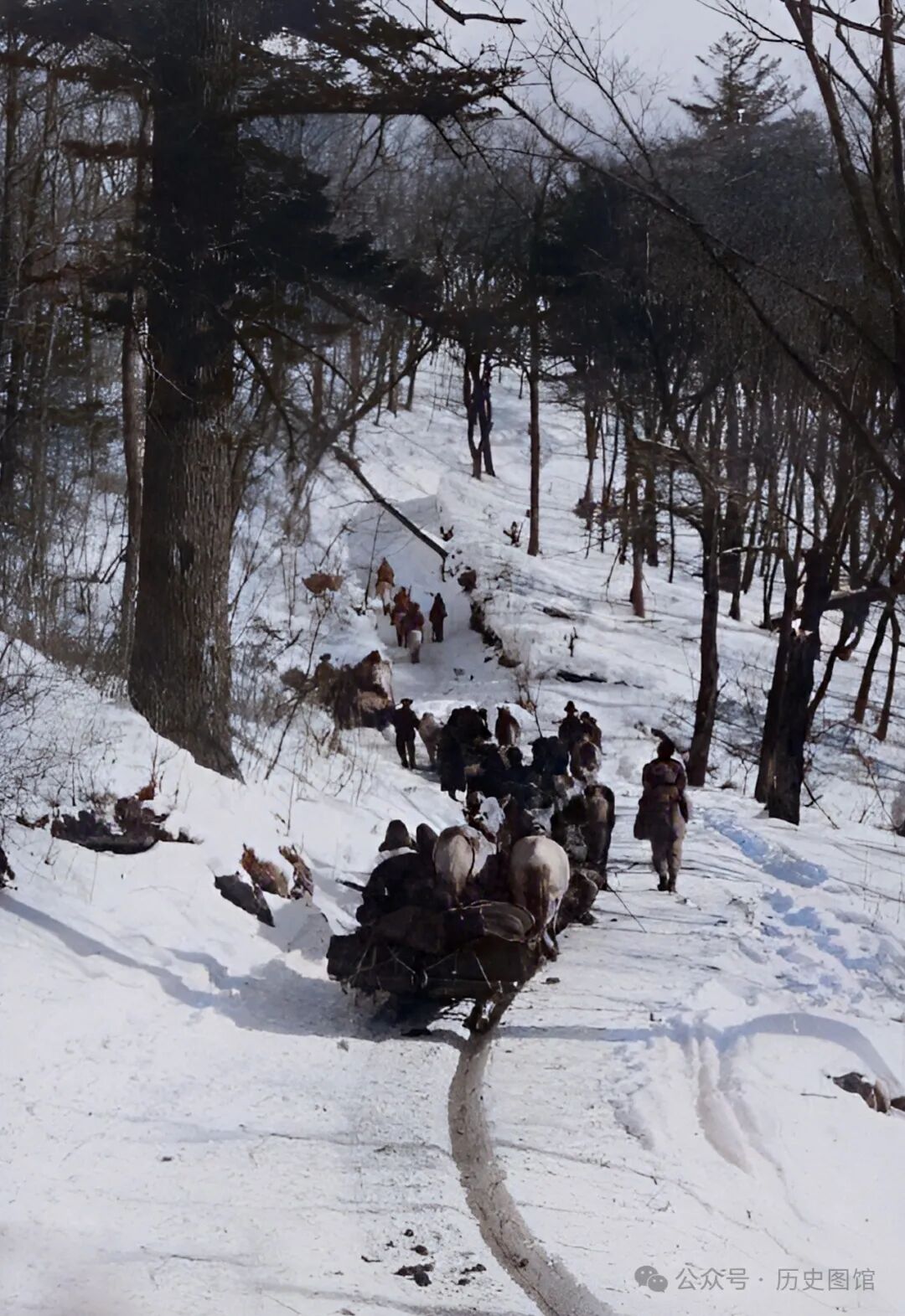 1932年,吉林敦化东北部的老爷岭大雪封山,当地人乘坐马拉爬犁出行。爬犁在雪地上滑行,留下了深深的车辙。爬犁既可以运货,又可以载人。