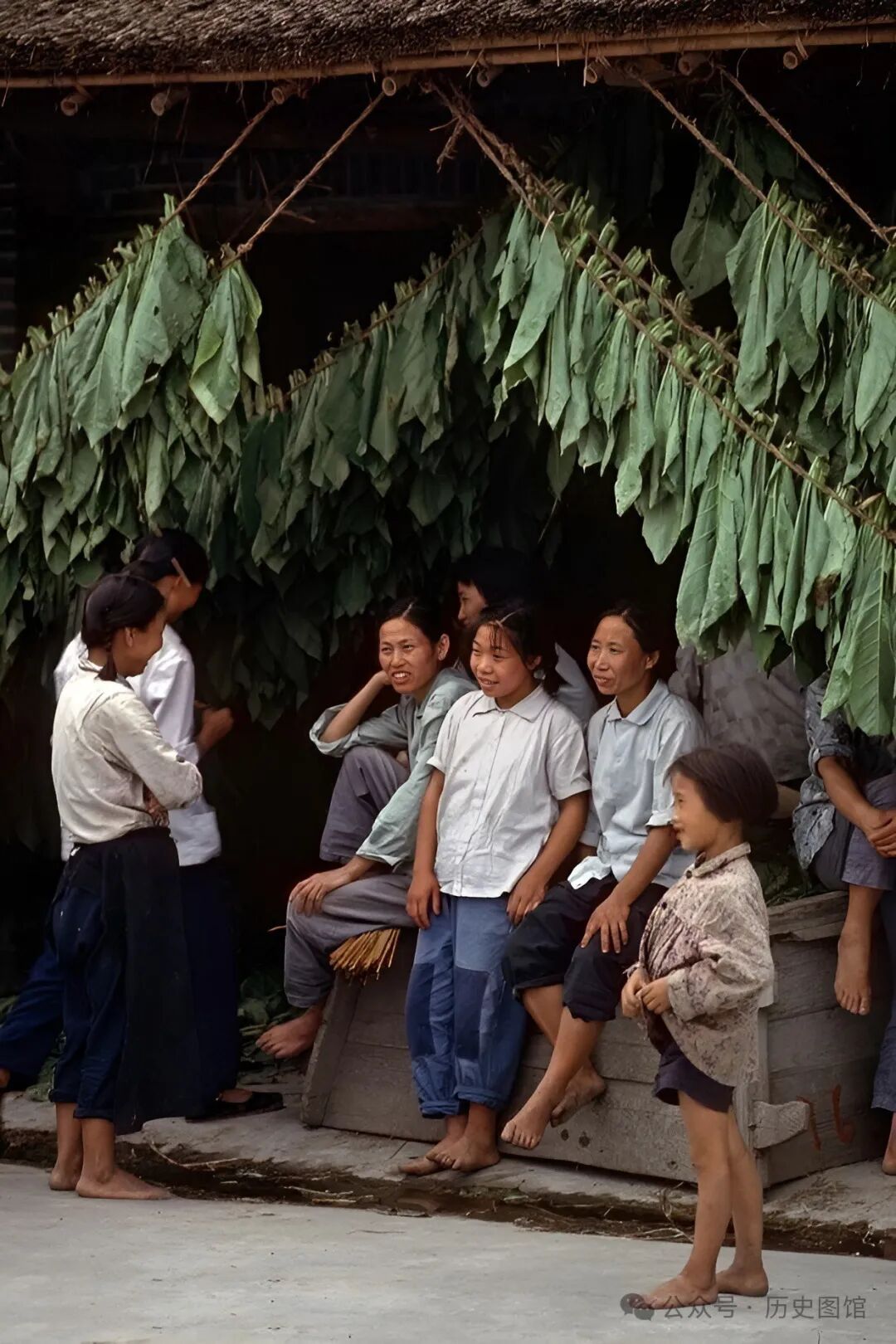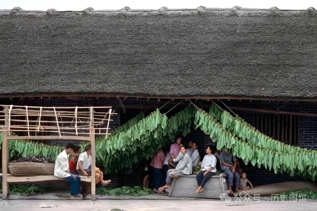 1981年,峨眉山川主乡,一个烟叶加工作坊前的景象。工人们将新采摘的烟叶,用绳子串起来悬挂在屋檐下。